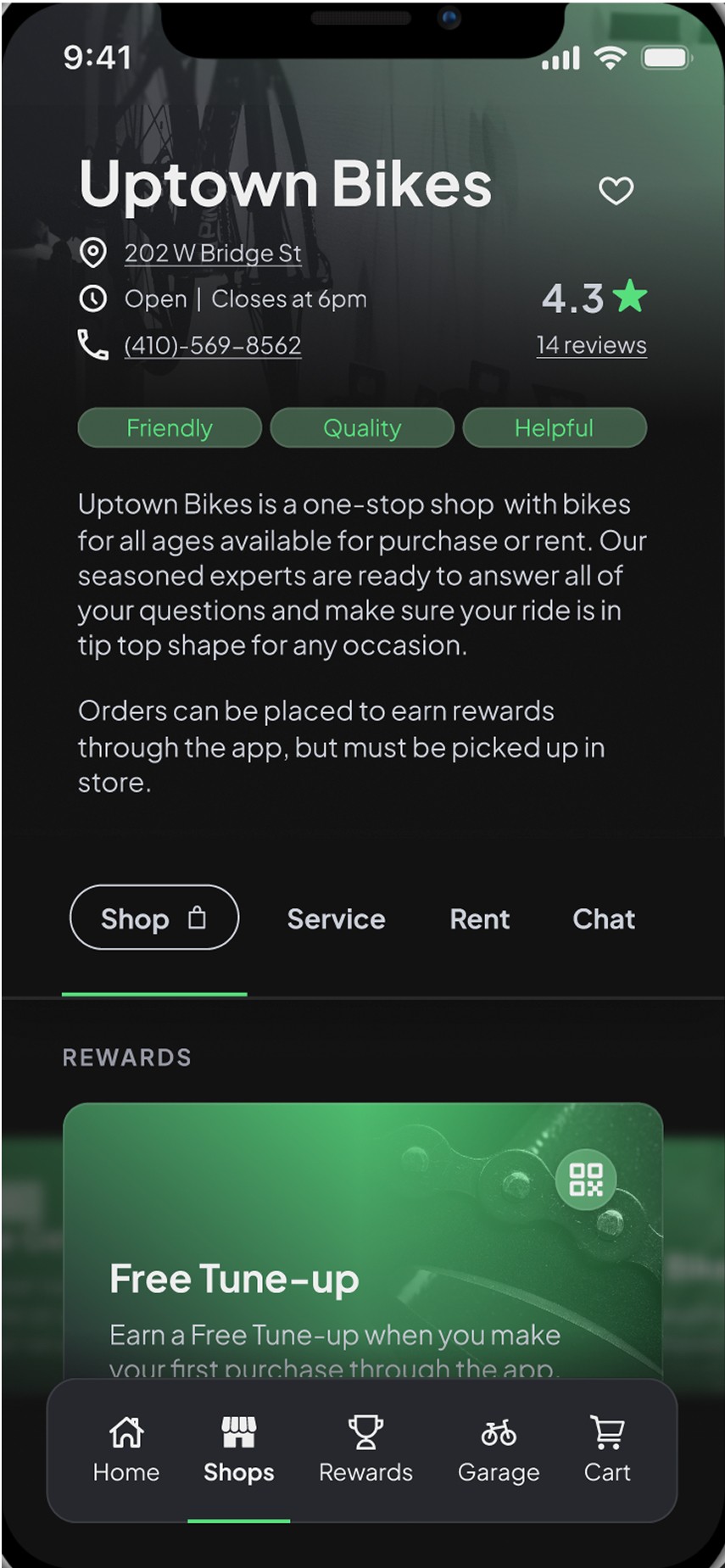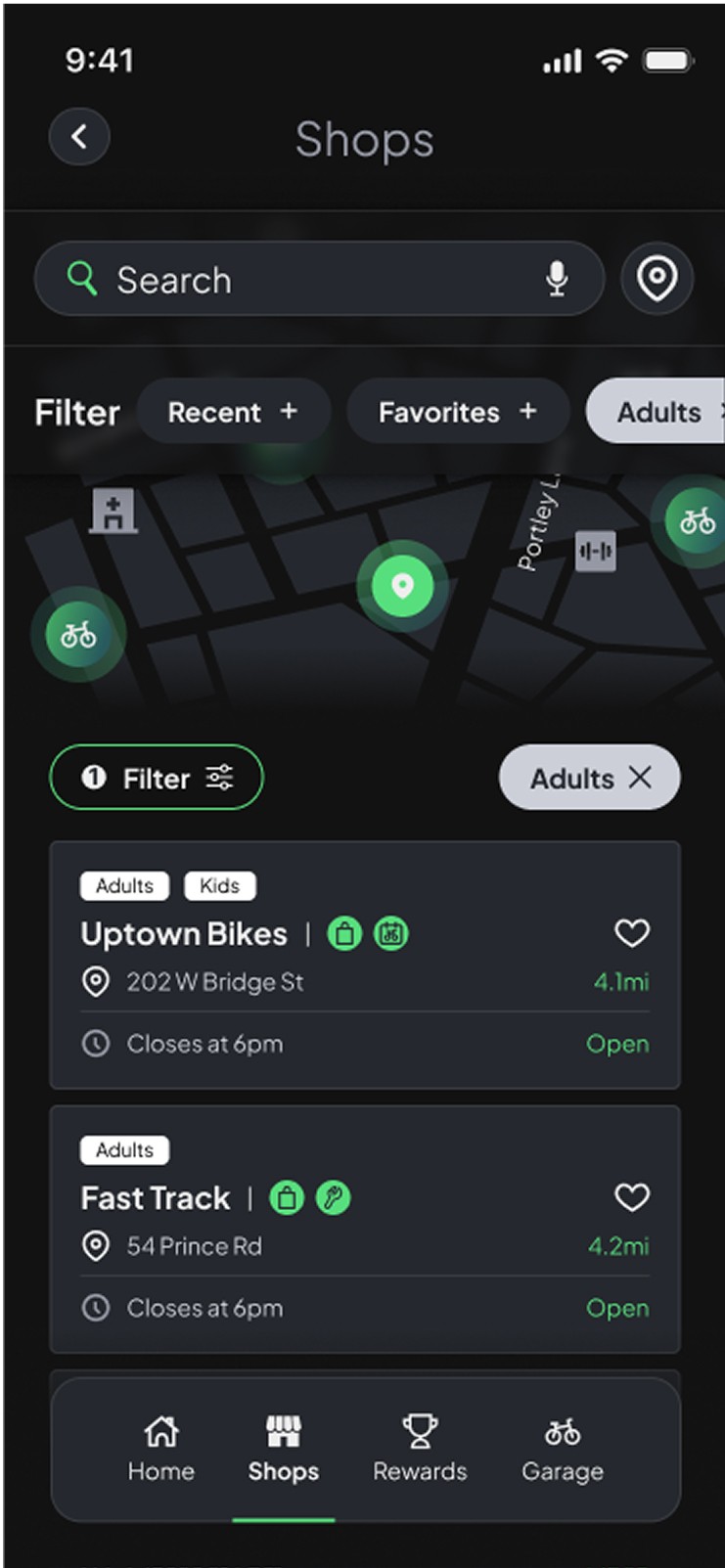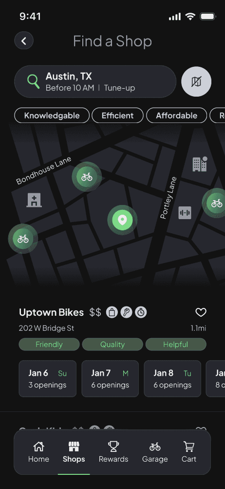 Spoke is a conceptual iOS app that unifies shopping, renting, and maintenance journeys into a single marketplace, helping riders find the right bike shops based on their needs. Loyalty perks improve affordability and help shop owners build and establish relationships with a growing customer base.